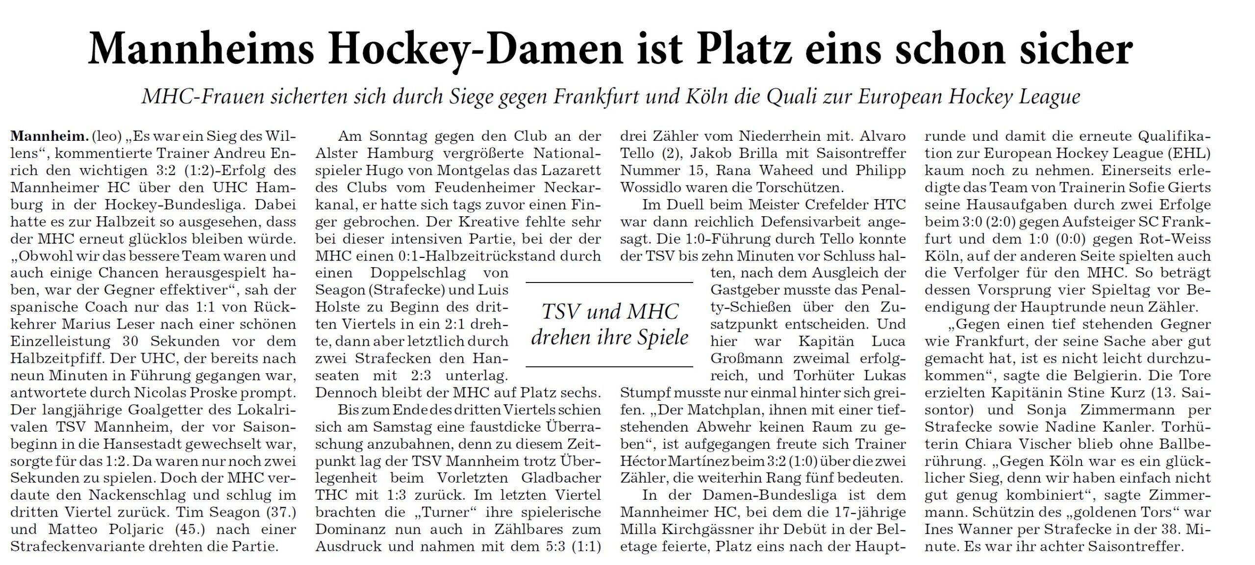 „Mannheims Hockey-Damen ist Platz eins schon sicher“ – RNZ vom 20. April